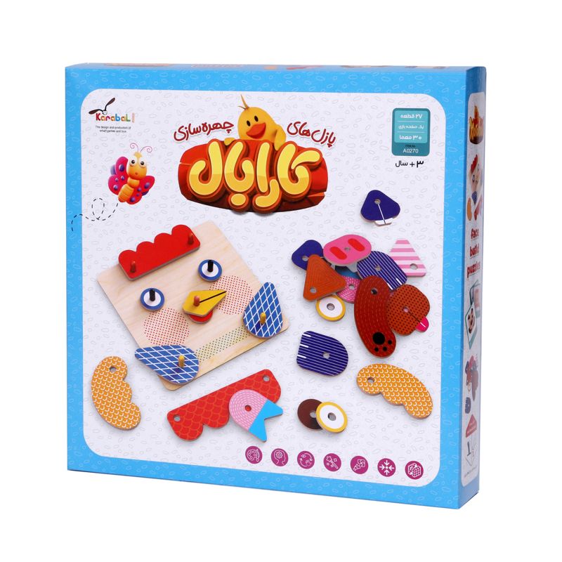 بازی تطابق اشکال کارابال مناسب سن سه سال و نیم تا پیش دبستان است. این بازی دارای یک صفحه با پایه های سلیکونی و قطعات اجزای صورت حیوانات است. برای تقویت حل مسئله کارت های بازی را در اختیار کودکان قرار میدهیم تا از روی الگو چهره ها را بسازد. و برای پرورش خلاقیت از کودک میخواهیم به سلیقه ی خودش هر تصویری دوست دارد با قطعات بازی بسازد. این بازی بدلیل بسته بندی شیک، همچنین یک کادویی عالی خواهد بود.
